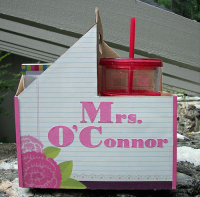 Have you guessed yet what I made my "tote" from? It is a beverage carrier from Sonic Drive In! I simply made a template, cut my paper (all from DCWV's Cherry Limeade Stack) and stuck it down. I trimmed out the corners with Bazzill's Pink Chablis card stock to cover my seams. Then I filled it with a thermal cup, note cards, the M & M's, pencils, cute little sticky note pads and some erasers.